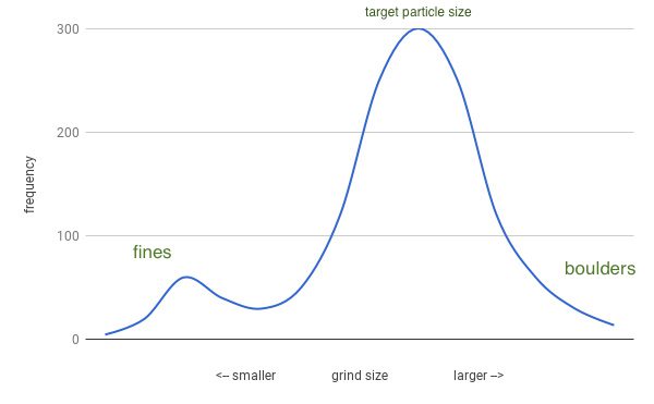 نویسندگان کتاب اسپرسوی ایلی بیان کردند که ذرات ریز سطح عصارهگیری لازم را فراهم میکنند، در حالی که ذرات درشتتر برای دستیابی به سرعت جریان آب کافی در میان بستر قهوهی اسپرسو لازم هستند. اگر ذرات ریز بسیاری وجود داشته باشد عصارهگیری پایین خواهد بود، و اگر ذرات درشت خیلی کم باشند جریان آب مسدود میشود. با وجود اینکه اسپرسو نیاز به عصارهگیری سریع از طریق سایش دارد، به نظر میرسد مقداری ذرات ریز برای یک شات اسپرسوی رضایتبخش لازم باشد. (من فکر میکنم که به طور تئوری جدا کردن سابهها در بازهای ۱۰۰ تا ۲۰۰ میکرونی و استفاده از آنها برای گرفتن اسپرسویی خوشمزه و عاری از ذرات ریز ممکن باشد، اما چنین چیزی در کافه عملی نیست.) سهم ایدهال برای ذرات ریز چقدر است؟ البته که هیچ کس نمیداند. برای پیچیده کردن موضوع به نظر میرسد دو زیر مجموعه از ذرات ریز وجود داشته باشد؛ اجازه دهید آن ها را “ذرات ریزِ درشتتر” و “گَردِ قهوه” بنامیم. وجود کوچکترین ذرات ریز یا گرد قهوه احتمالا کیفیت اسپرسو را از طریق کم کردنِ نامتناسب سرعت جریان نسبت به مشارکتشان در عصارهگیری خراب میکند بنابراین به تنظیمات آسیاب درشتتر نیاز است که در عوض عصارهگیری کاهش مییابد.